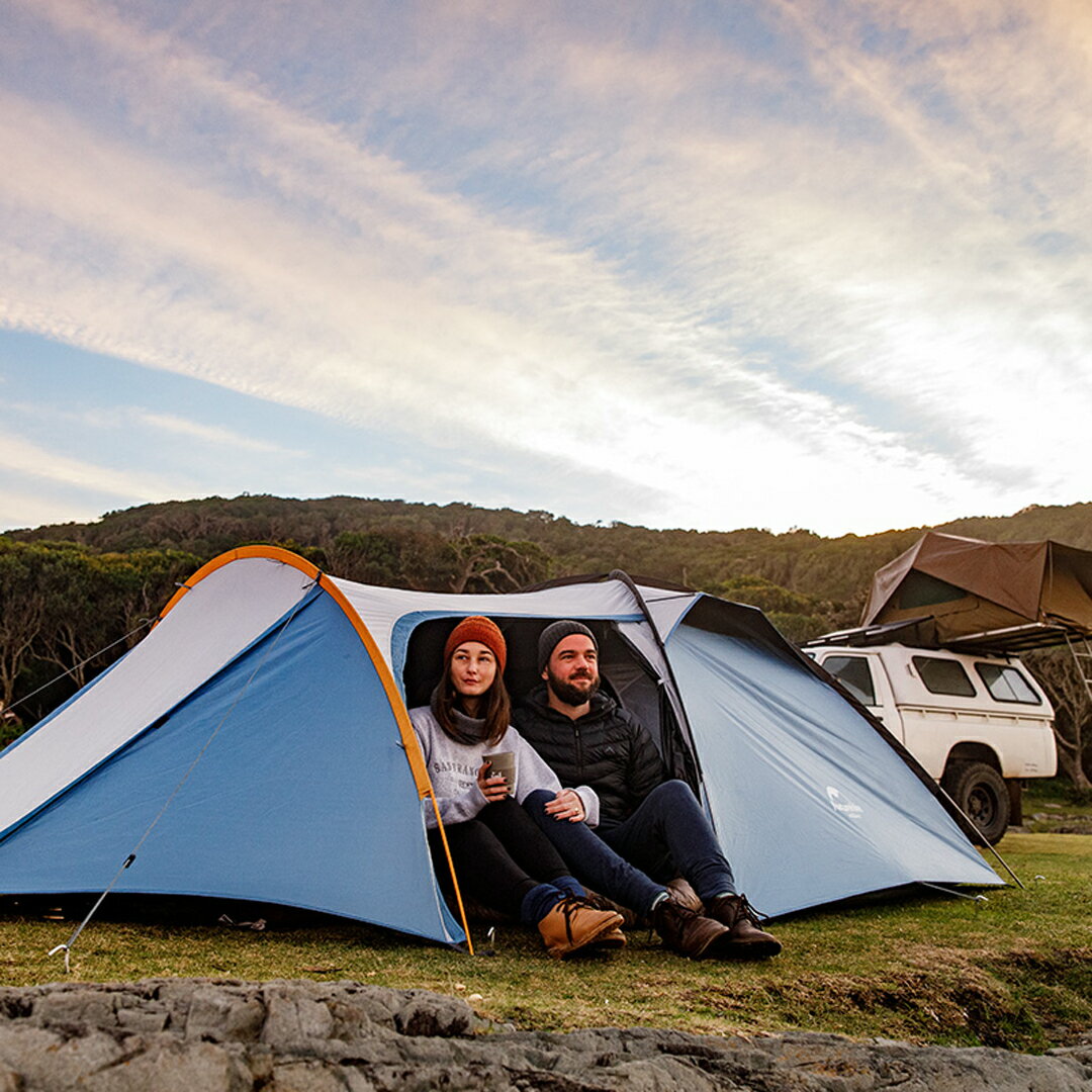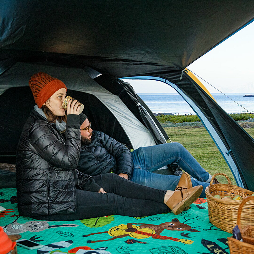 前室にはテント外でもくつろげるスペース、レジャーシート やテーブルを持ち寄ってゆったりできます 【高い通気性】二重構造となっており窓を全開すれば、熱がこもりにくく風がしっかりと通ります。